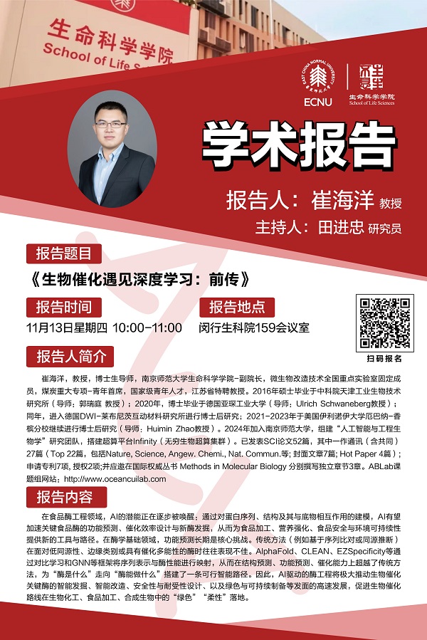 崔海洋,教授,博士生导师,南京师范大学生命科学学院-副院长,微生物改造技术全国重点实验室固定成员,煤炭重大专项-青年首席,国家级青年人才,江苏省特聘教授。2016年硕士毕业于中科院天津工业生物技术研究所(导师:郭瑞庭 教授);2020年,博士毕业于德国亚琛工业大学(导师:Ulrich Schwaneberg教授);同年,进入德国DWI-莱布尼茨互动材料研究所进行博士后研究;2021-2023年于美国伊利诺伊大学厄巴纳-香槟分校继续进行博士后研究(导师:Huimin Zhao教授)。2024年加入南京师范大学,组建“人工智能与工程生物学”研究团队,搭建超算平台Infinity(无穷生物超算集群)。已发表SCI论文52篇,其中一作通讯(含共同)27篇(Top 22篇,包括Nature, Science, Angew. Chemi., Nat. Commun.等; 封面文章7篇; Hot Paper 4篇);申请专利7项, 授权2项;并应邀在国际权威丛书 Methods in Molecular Biology 分别撰写独立章节3章。