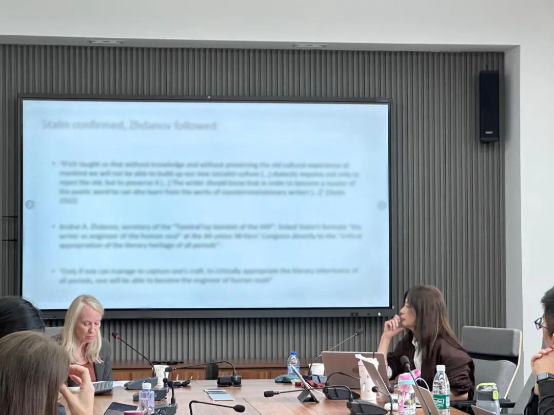 交流环节,主持人田洪敏教授评议指出,在“national literature”与“international  literature”之间,可以清晰地界定俄苏文化在1930年代对于“世界文学遗产”的整合观念。该研究为理解文学经典的形成、文化权力的运作以及“世界文学”概念的历史性提供了极具启发性的分析框架。现场博士生研究生杨健强、窦晓菲等则围绕《文学批评》期刊的真实角色、文化“适用”与“挪用”的理论区分、以及相关文学遗产在后苏联时代的命运等问题与主讲人展开了热烈讨论。