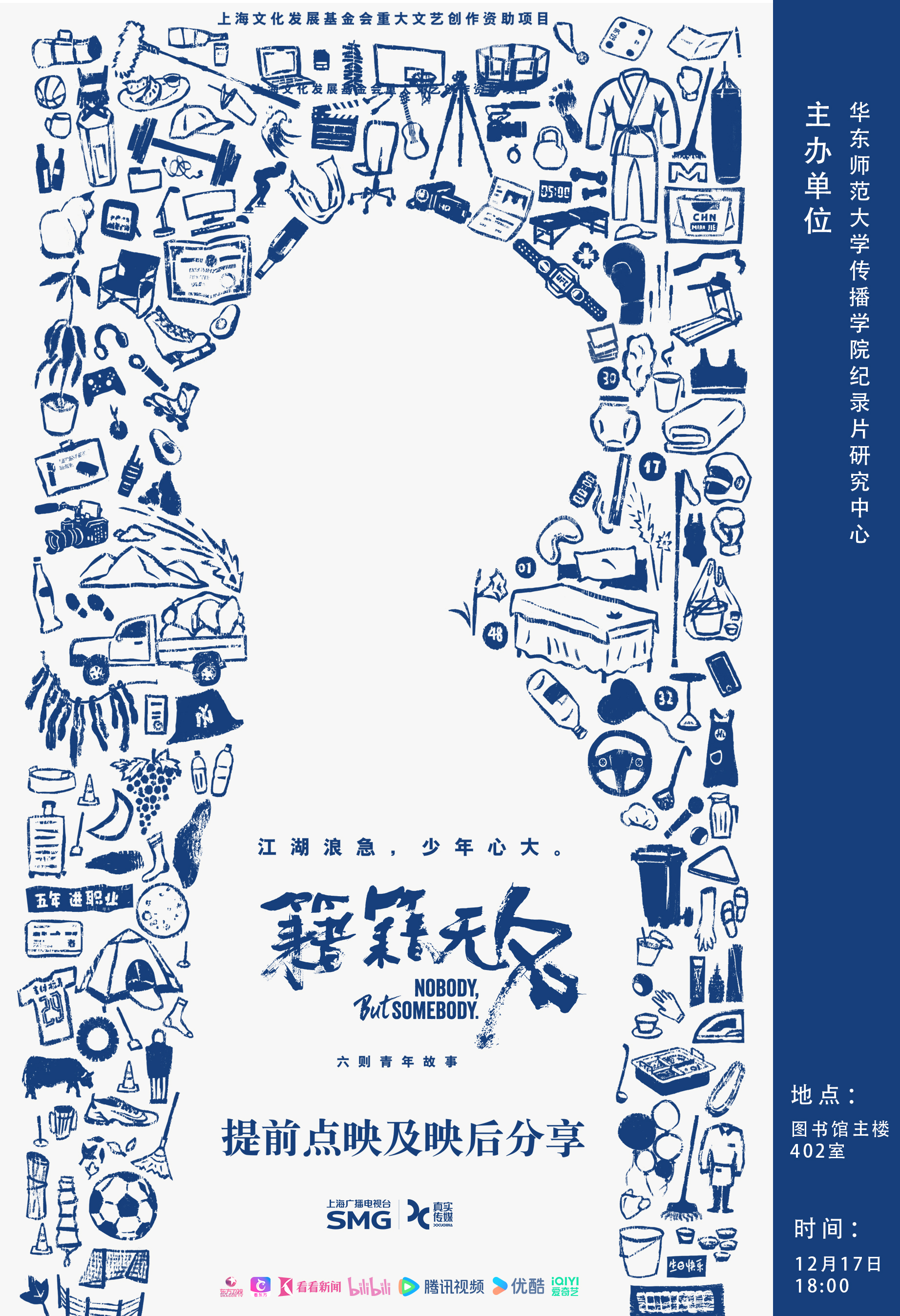 12月17日,由华东师范大学传播学院纪录片研究中心主办的“《《籍籍无名》华东师范大学校园点映及映后分享会”将在华东师大闵行校区图书馆举行。本次活动将点映《籍籍无名》最终集《苏文源,天天开心!》,点映之后,本片导演还将和华东师范大学师生展开深度对谈。