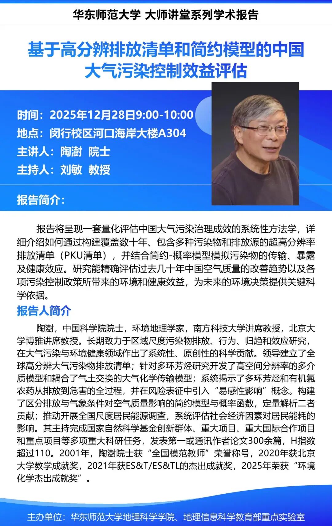 【讲座预告12-28】基于高分辨率排放清单和简约模型的中国大气污染控制效益评估