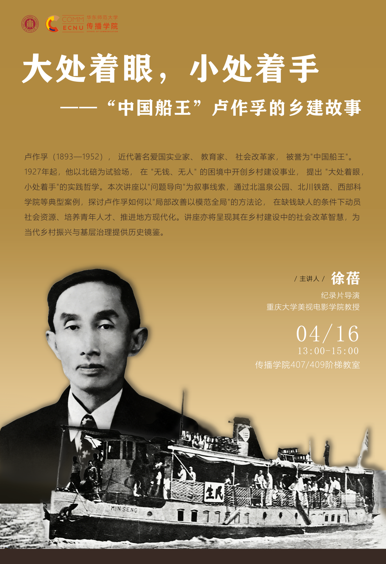 卢作孚(1893—1952),近代著名爱国实业家、教育家、社会改革家,被誉为"中国船王"。1927年起,他以北碚为试验场,在"无钱、无人"的困境中开创乡村建设事业,提出"大处着眼,小处着手"的实践哲学。 本次讲座以"问题导向"为叙事线索,通过北温泉公园、北川铁路、西部科学院等典型案例,探讨卢作孚如何以"局部改善以模范全局"的方法论,在缺钱缺人的条件下动员社会资源、培养青年人才、推进地方现代化。讲座亦将呈现其在乡村建设中的社会改革智慧,为当代乡村振兴与基层治理提供历史镜鉴。