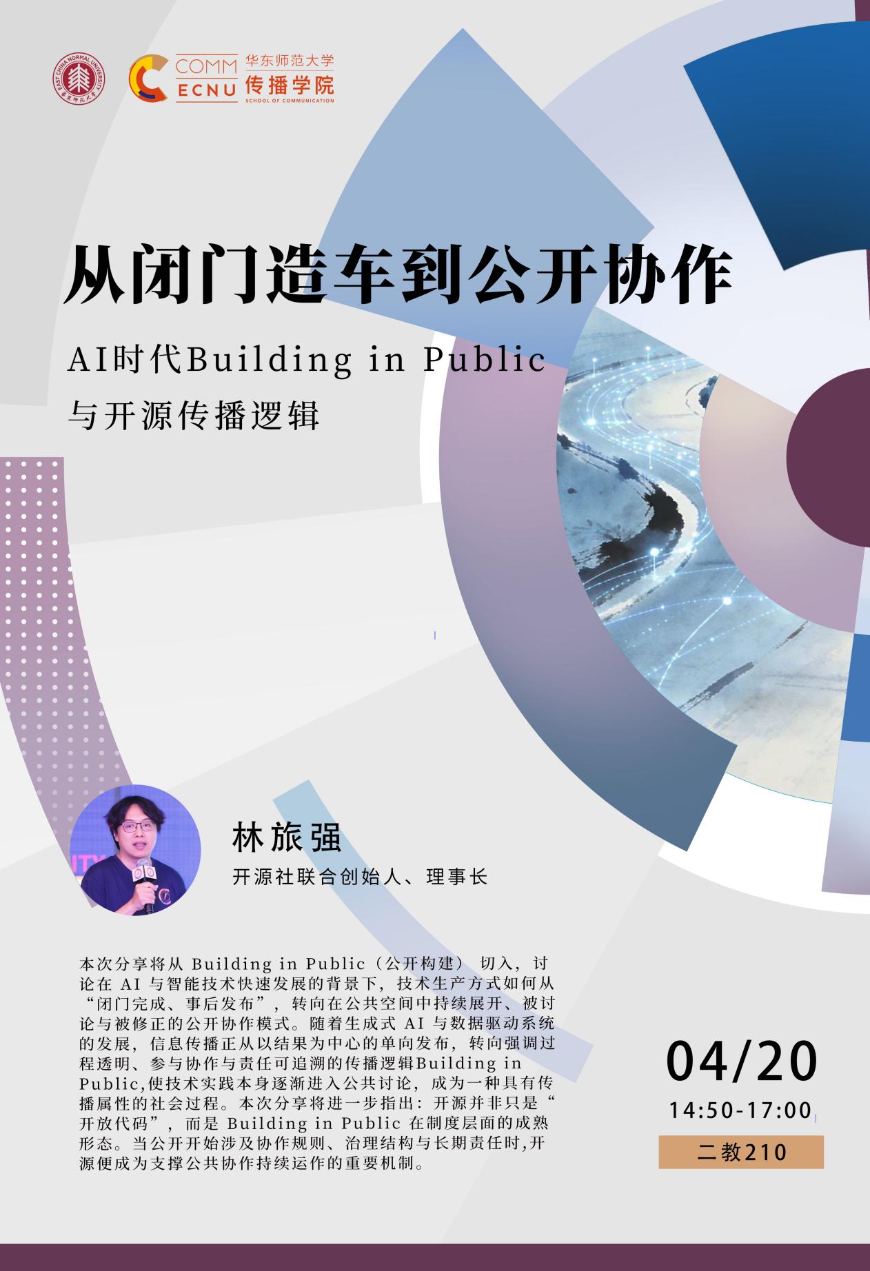 本次分享将从Building in Public(公开构建)切入,讨论在AI与智能技术快速发展的背景下,技术生产方式如何从“闭门完成、事后发布”,转向在公共空间中持续展开、被讨论与被修正的公开协作模式。随着生成式AI与数据驱动系统的发展,信息传播正从以结果为中心的单向发布,转向强调过程透明、参与协作与责任可追溯的传播逻辑。Building in Public使技术实践本身逐渐进入公共讨论,成为一种具有传播属性的社会过程。本次分享将进一步指出:开源并非只是“开放代码”,而是Building in Public在制度层面的成熟形态。当公开开始涉及协作规则、治理结构与长期责任时,开源便成为支撑公共协作持续运作的重要机制。